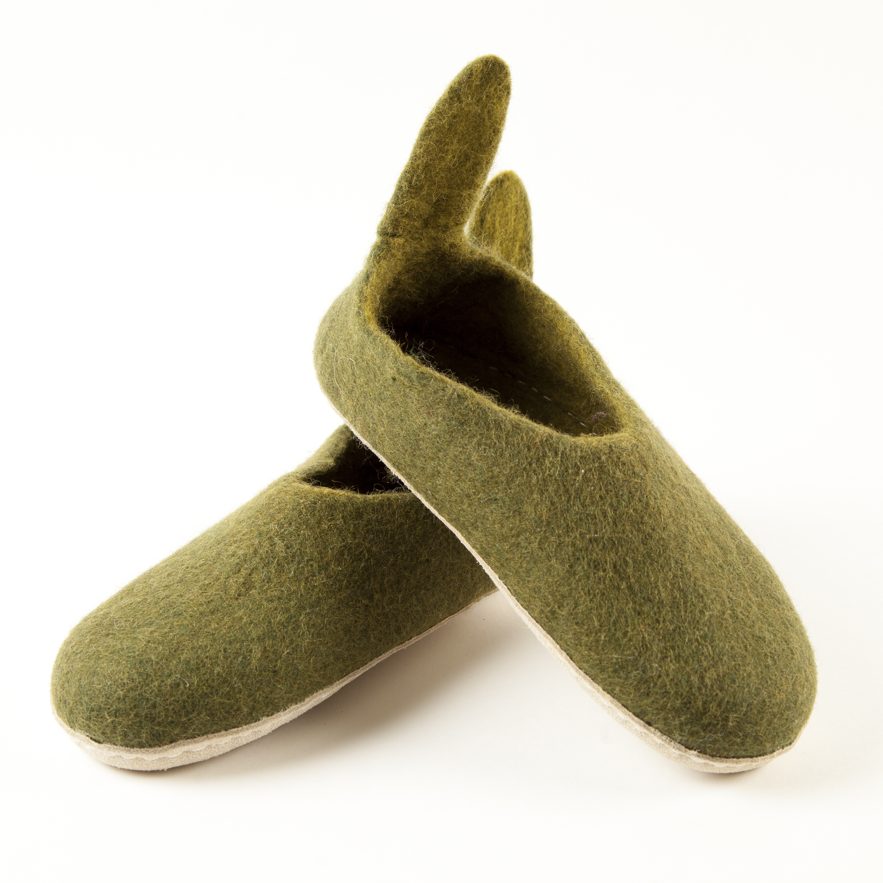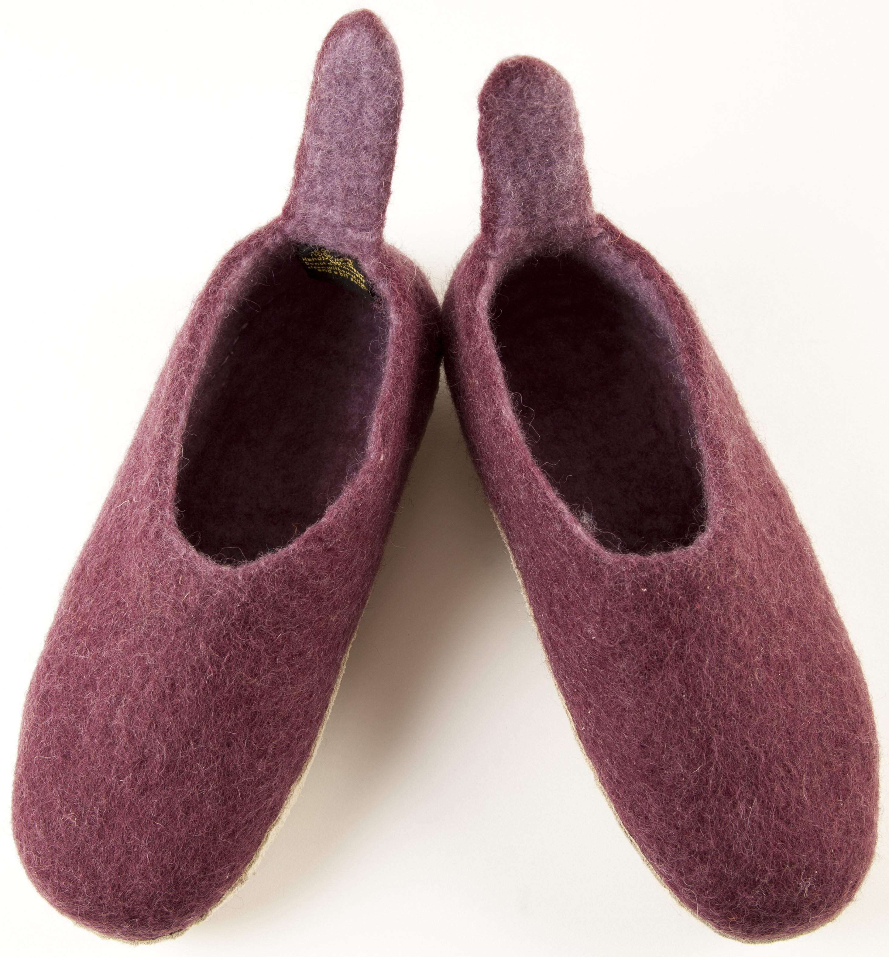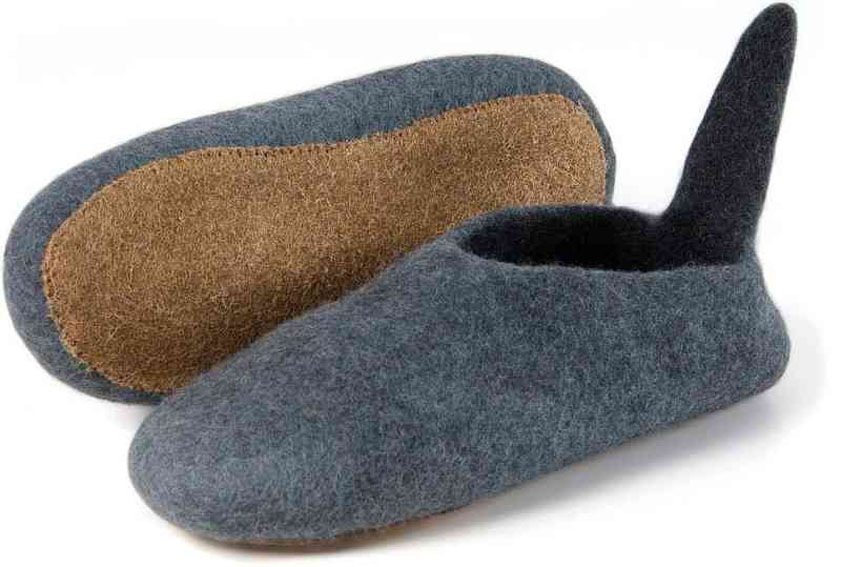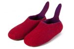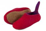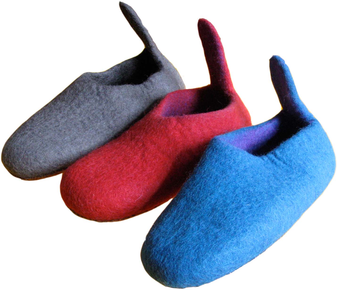 Hausschuhe in wunderschönen Farben. Die handgefilzten, sehr festen und robusten Hausschuhe sind aus reiner Schafswolle und haben entweder eine strapazierfähige Gummimilchsohle oder eine Ledersohle - beide sorgsam angenäht. Die Schuhe sitzen angenehm fest am Fuß, das Anziehen geht leicht wegen der witzigen "Nase" hinten.