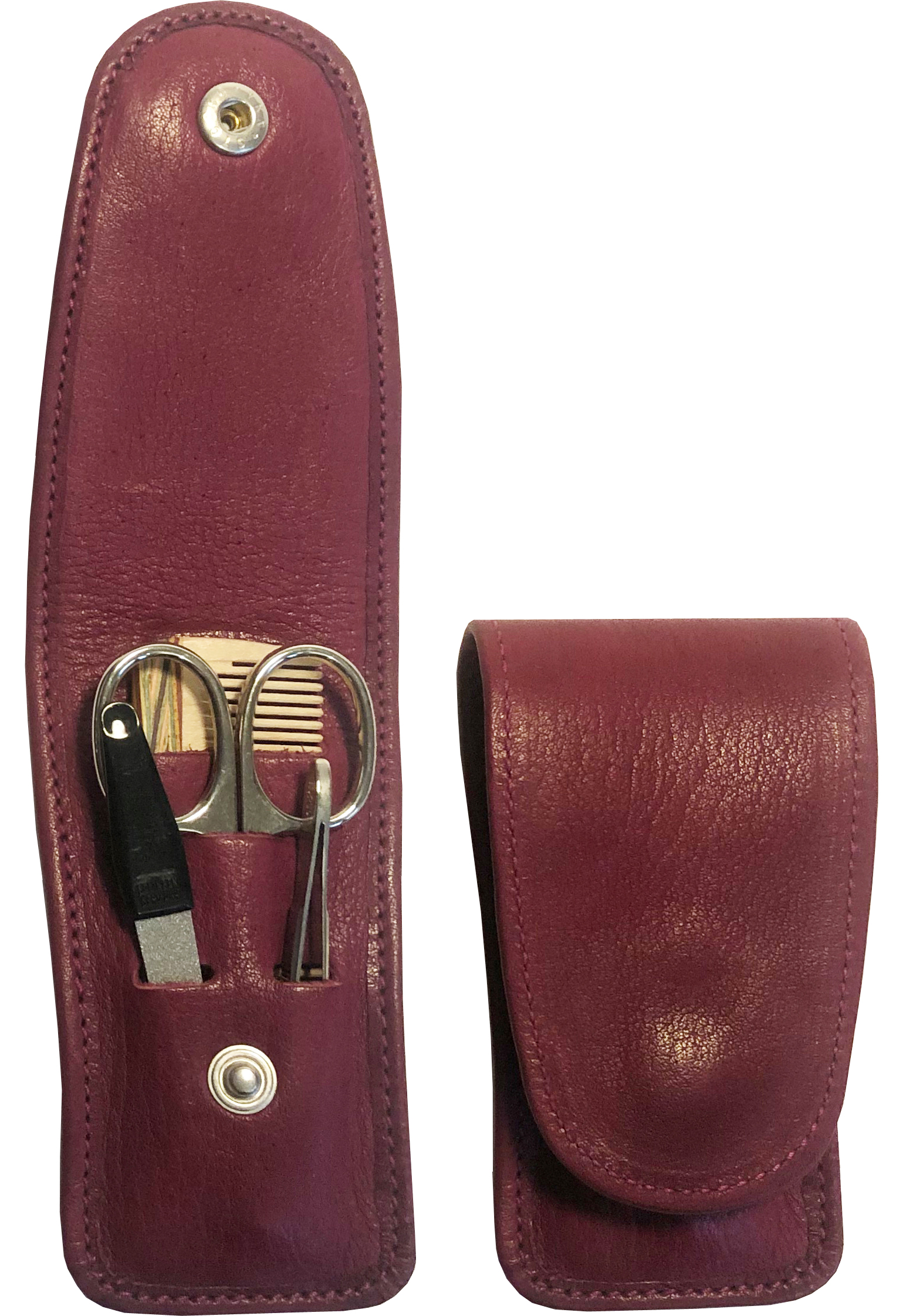 Ein schönes Manikür-Set mit elegantem Holzkamm und hochwertiger Universalschere, Pinzette und Saphirfeile von Duisberg/Solingen, in einem geschmackvollen Etui aus Pflanzengegerbtem Leder. Der Holzkamm wird hergestellt von Kammmacher Martin Kost, in Windelsbach bei Rothenburg ob der Tauber.