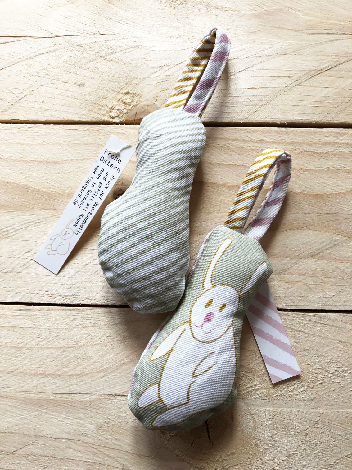 Ein kleines süßes Osterhäschen für den Osterstrauch oder als ein besonderes Geschenk zum Ostern. Digitaldruck auf festem Biobaumwoll-Panama und mit veganem Kapok gefüllt. Eine vegane Hase also....ist das ein Widerspruch? Von ingegerd entworfen und in Deutschland umweltschonend gedruckt. Die Hase misst mit Aufhänger 18x6cm. Preis 6,90€, drei Häschen für 17,90€