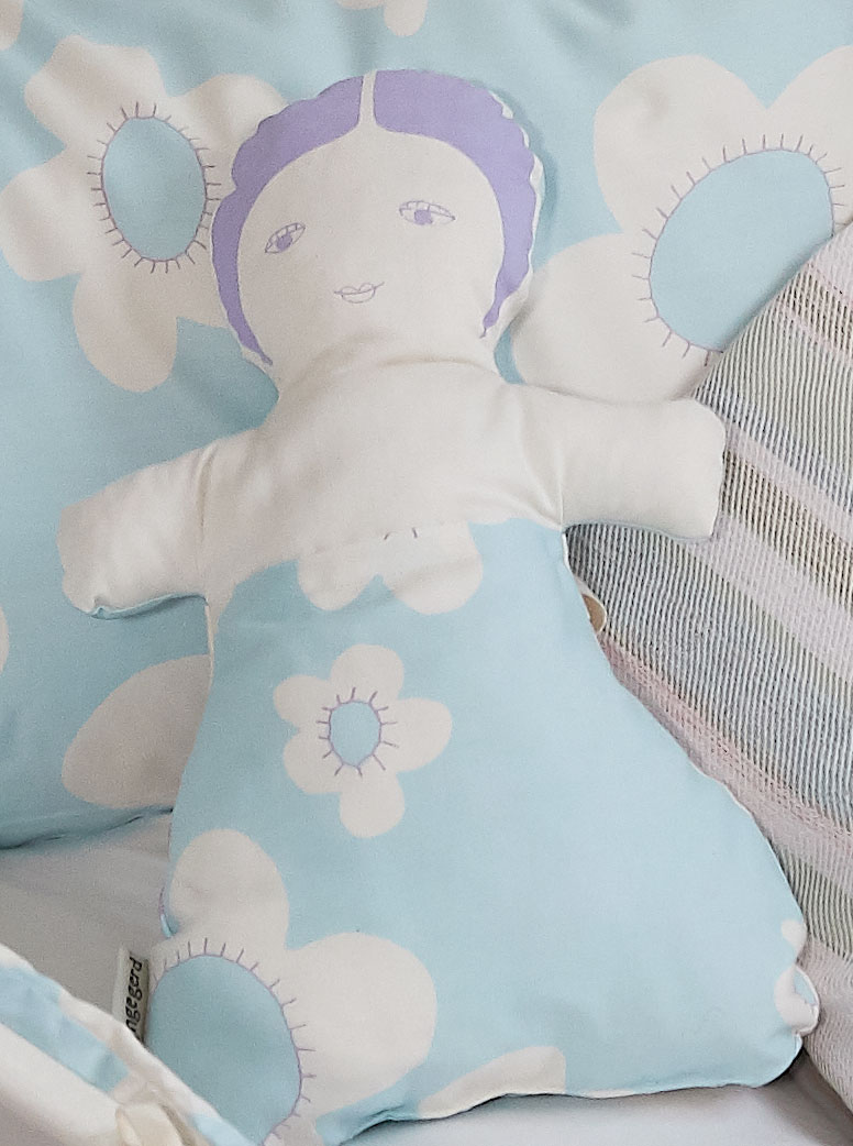 Puppe, handgedruckt und mit Öko-Wollnoppen gefüllt. Weich und kuschelig.Vorne Tasche für "Geheimnisse", hinten Schleife zum auf und zu-binden üben.Größe ca 24x38cm.Stilvolles skandinavisches Design in bester Öko-Qualität.Handwäsche bei 30°